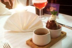 • La Zuppa Inglese luftiges Biskuit getränkt mit hausgemachtem Kermesbeeren- und Rum-Sirup sowie gefüllt mit Chantilly-Crème